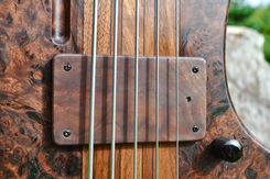 The bass features the SIMS Superquad pickup, which has 3 different voices (MM, Jazz and Precision) accessible by a toggle switch and indicated by the LED on the pickup. The pickup itself is housed in a custom cover made of the same Burr Oak as the wings. The SIMS pickup is paired with a Glockenklang 2 band preamp to ensure the bass can cover an even wider range of sounds.